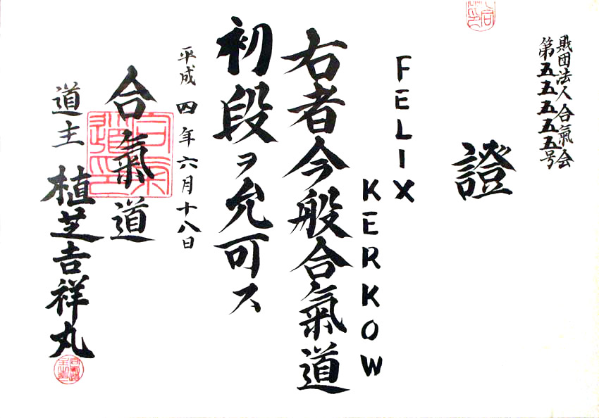 2017 Ernennung zum Yon-Dan (4.) durch Philippe Gouttard, 7. Dan Aikikai Tokyo.